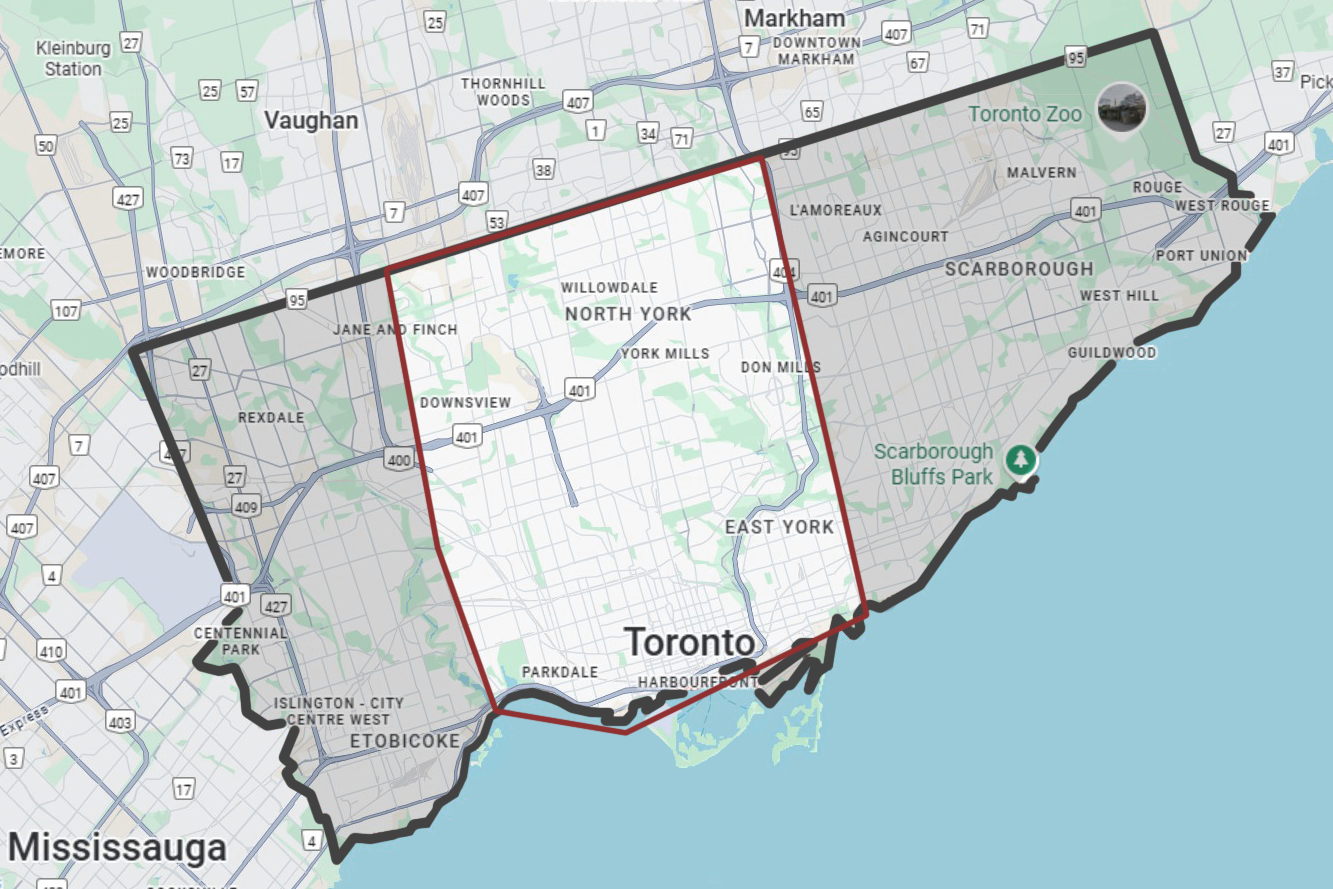 At this time delivery is offered from east to west in between Jane St. and the DVP. and from north to south from Steeles Ave. to the lake.